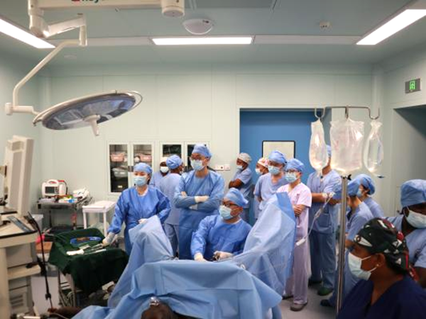 在临床指导中,输血科与检验科专家深入NRH相关科室,指导成分输血应用、实验室质量管理,并协助完成设备安装调试。急诊科专家与当地团队交流急危重症处理流程并开展床旁教学。泌尿外科团队围绕典型病例开展术前查房、手术示教与术后查房,联合完成经尿道前列腺电切术及输尿管钬激光碎石并双J管置入术等微创手术。麻醉科专家演示腰麻与全麻操作,并向NRH捐赠可视喉镜;手术室护理专家指导输液管理与器械规范使用,并参与手术配合。术后查房重点讲解恢复观察、并发症识别、管路管理及随访要点,患者恢复良好。